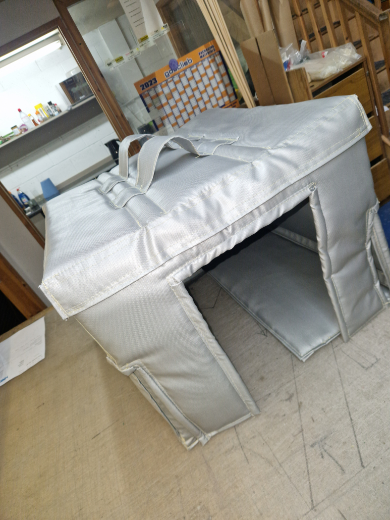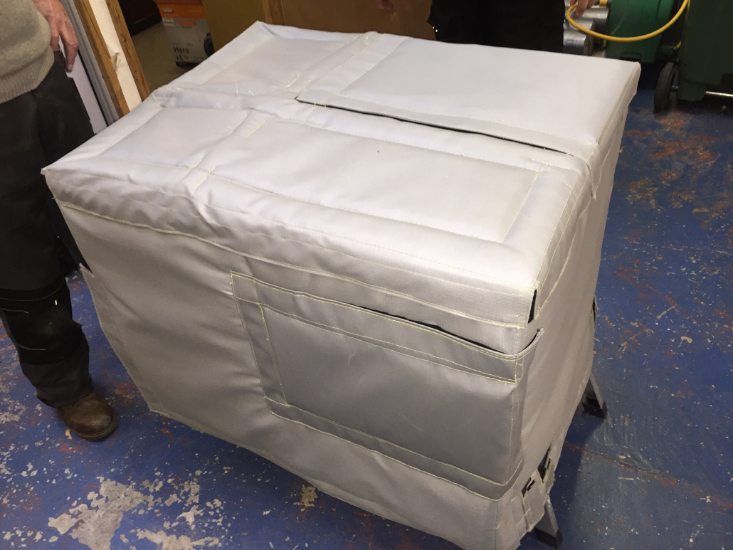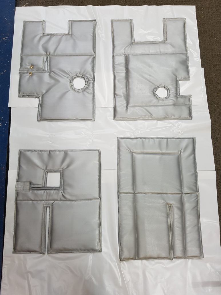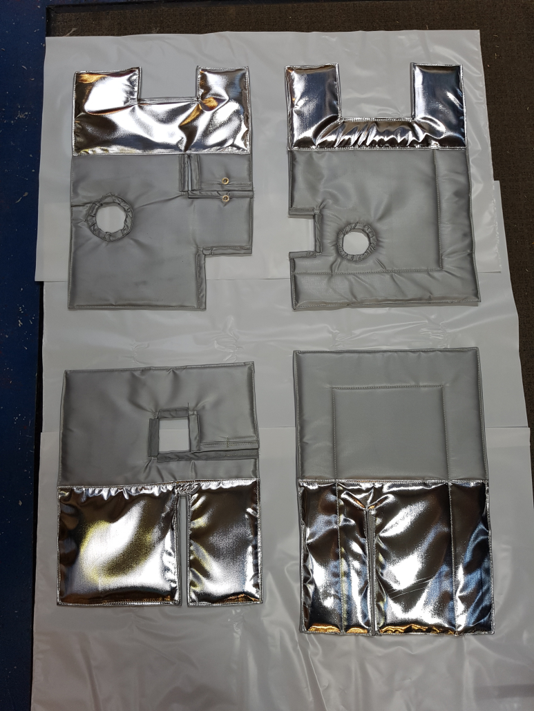 Each panel is enclosed in a final outer layer of high temperature silicon coated fibre glass material for health and safety and fire regulations.