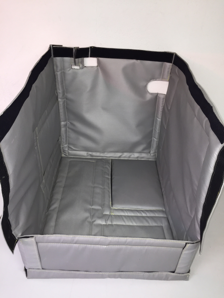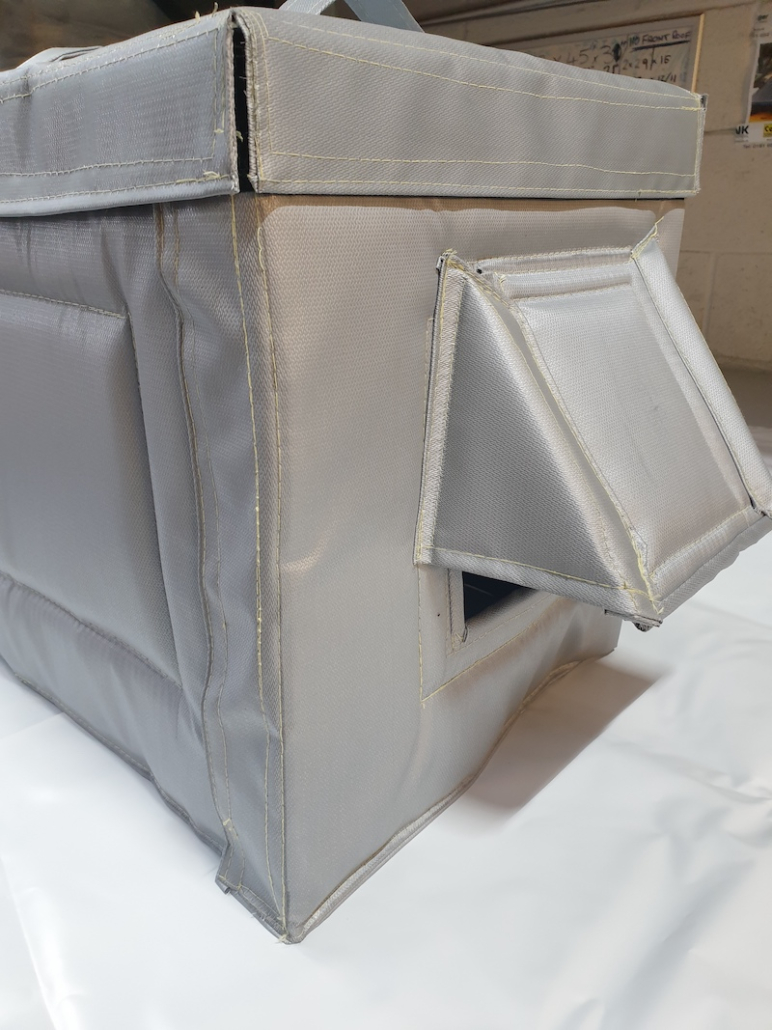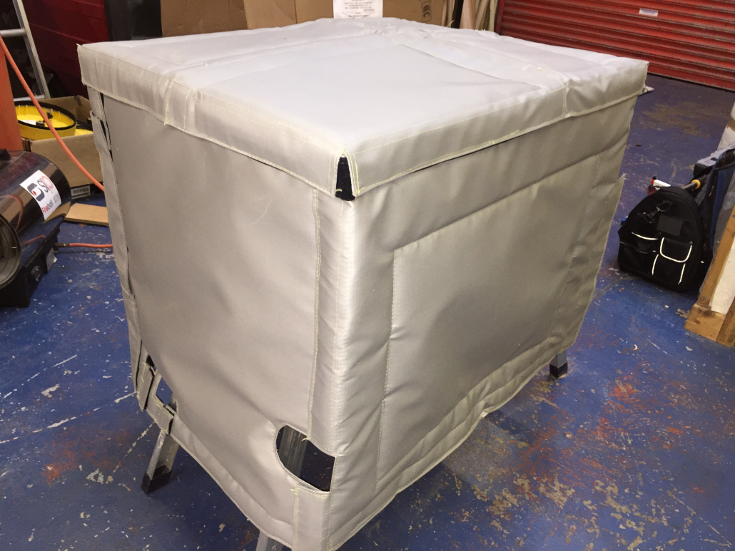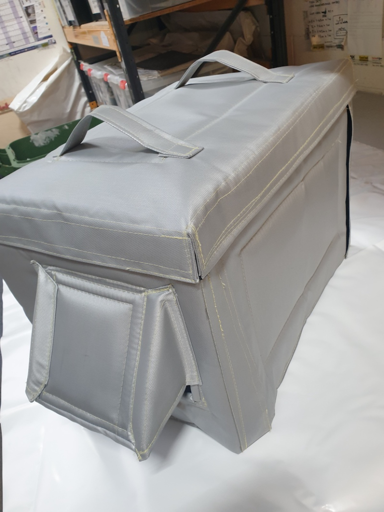 Each panel is enclosed in a final outer layer of high temperature silicon coated fibre glass material for health and safety and fire regulations.