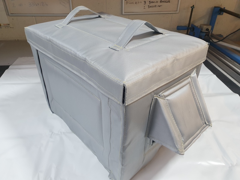 Each side is made up exactly the same as our standard vehicle engine blankets which is, a sheet of blocking Lead, sandwiched inside two layers of class “O” fire rated acoustic foam, covered with a high heat resistant Fortaglas fabric. The lead blocks the generator noise, and the foam absorbs the airborne sounds. We also now add stiffening rods sewn inside the corners and bottom of the cover, thus preventing any sagging and therefore helps to keep its original shape, along with providing further noise reduction.
